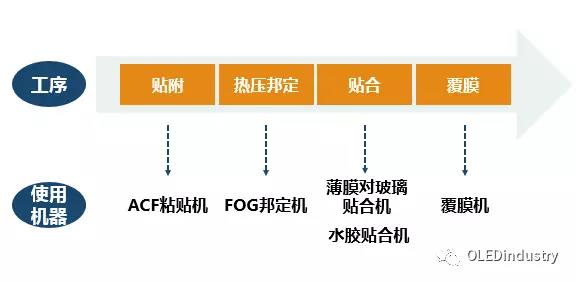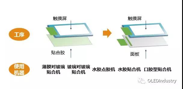 模組組裝工序:是將觸控感應板和玻璃蓋板組裝形成觸摸屏的過程,主要生產工序包括貼附、熱壓、貼合、覆膜等。根據原材料的不同,貼合工藝可分為薄膜對玻璃貼合、玻璃對玻璃貼合、水膠貼合等類別。